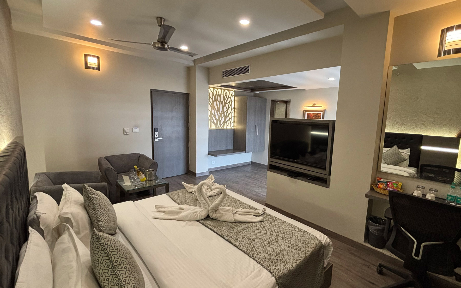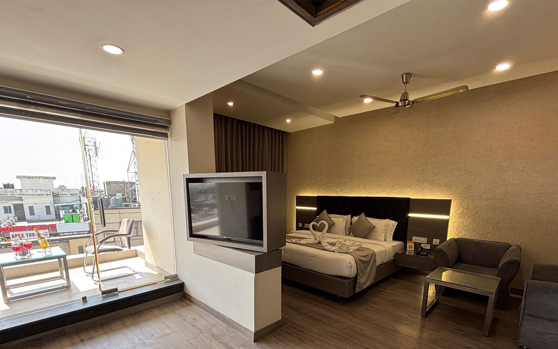 Experience elevated comfort in our 350 sq ft Club Room, designed for a spacious and stylish stay. Enjoy a separate shower area and a 150 sq ft private balcony with stunning city views, perfect for unwinding.
